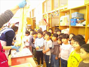 つきたてのお餅を目の前で見て、匂いや柔らかさを実感する子どもたち。 『 すご~い ゴムみたいにすごいのびるね!! 』 『 わぁ~ いいにおい はやくたべたいなぁ~ 』 |
