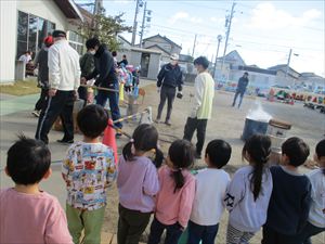 サツマイモを入れると、ほんのり甘くて伸びが良い美味しいお餅になるんですよ! もち米を蒸す匂いに、とても敏感に反応する見学の子どもたち。 『 なんか、いいにおいがするよ~! 』 『 よいしょ! よいしょ! 』 『 がんばれ~! がんばれ~! 』 餅をつくのは、ハッスルパパさんからお手伝いのお父さんたちです。 こども園総出で盛り上がります☆☆☆ 園庭には、もちをつく音と子どもたちの元気な掛け声が響きます。 |