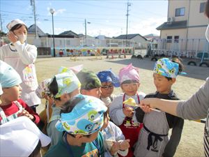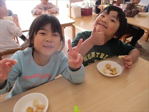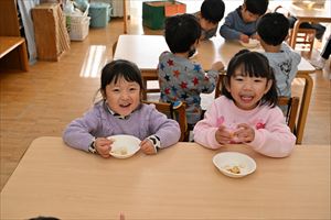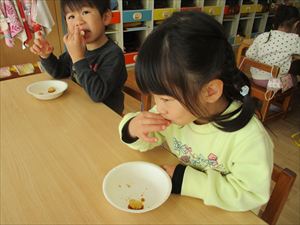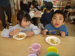 『 ゆり組さんがついたお餅、おいしいね 』 『 私は、おしょうゆ味が好き! 』 つきたてのお餅(味付なし)、きな粉味、しょうゆ味を食べ比べた子どもたち。 降園時には何人かの子どもから 『 おもち、おかわりしたよ! 』と報告も・・・。 年少さんや年中さんからは、 『 ゆりさんになったら ぼくもお餅つきたいな~! 』 と、いう声も・・・。 大きくなってからの楽しみがひとつ増えたようですね。 |