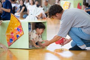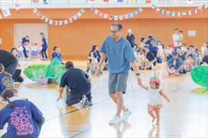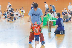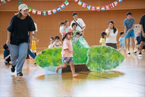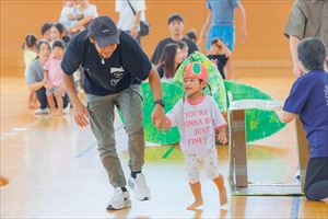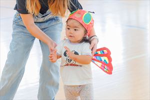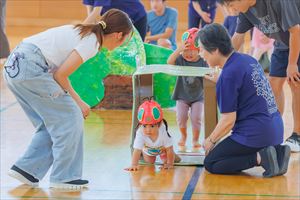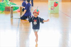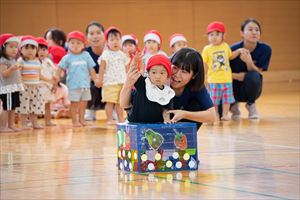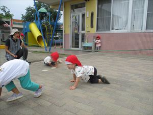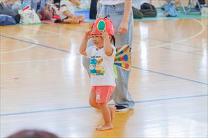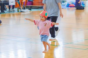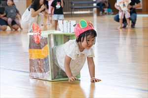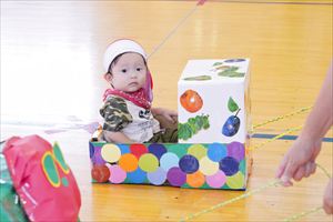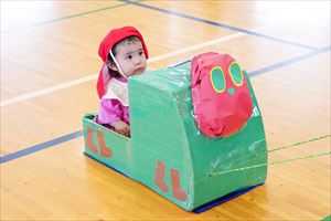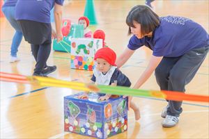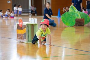 の親子競技【 ちびっこあおむし ちょうちょうになぁーれ 】です。 あおむしになっておいしいお菓子を食べて、大きなちょうちょになるよ! 最後は、とっても素敵な羽を背負って、ヒラヒラとかわいらしく舞っていましたね💕 チューリップ学級対象(2歳児)のお友達も参加してくれました! |