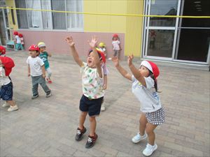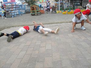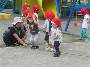 長縄を使って、飛んだり転がったり身体を動かして遊びました。 『 ニョロニョロニョロ~ ヘビさんの上をジャンプしちゃおう!! 』 くねくねと動く縄を目で追いながら、真剣に跨ぐ子ども達。 『 今度はウサギさんになって、ピョンピョン ジャンプ!! 』 『 次は、おいしいおいしい焼き芋に変身して ゴロゴロ転がって~ 』 最後は、みんなで縄を持って・・・これは!? 運動会でお兄さん、お姉さんがやったバルーンの真似っこでした~★★★ |