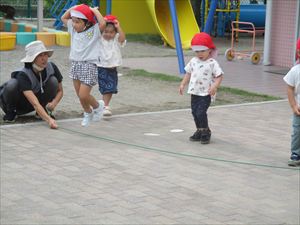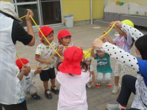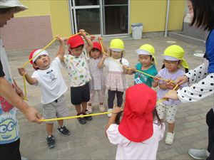 さくら組(2歳児)さんとすずらん組(満3歳児)さんが【 縄遊び 】を楽しんでいる様子です。
