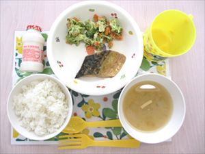 今日の給食です ごはん 魚のスタミナ焼き ブロッコリーの胡麻マヨサラダ(人参) 味噌汁(高野豆腐・玉ねぎ・葉ネギ) ラブミープラス |