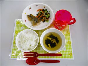 今日の給食です 菜飯 豆腐ハンバーグ(いんげん・玉ねぎ) ほうれん草の胡麻和え(人参) 味噌汁(玉ねぎ・人参) |