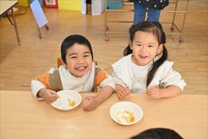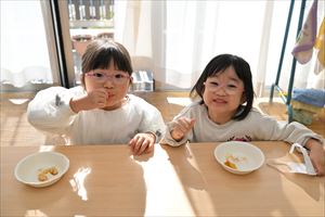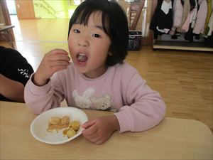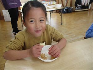 『 ゆり組さんがついたお餅、おいしいね 』 『 私は、おしょうゆ味が好き! 』 つきたてのお餅(味付なし)、きな粉味、しょうゆ味を食べ比べた子どもたち。 降園時には何人かの子どもから 『 おもち、おかわりしたよ! 』と報告も・・・。 年少さんや年中さんからは、 『 ゆりさんになったら ぼくもお餅つきたいな~! 』 と、いう声も・・・。 大きくなってからの楽しみがひとつ増えたようですね。 |
