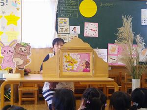 子どもたちは、絵本の世界に入り、心地良いひとときを過ごす ことが出来ました。 ボランティアの保護者の方、ご協力ありがとうございました。 秋というと、「食欲の秋」「スポーツの秋」「芸術の秋」 そして「読書の秋」といわれます。 『 さっきのお話、すごくおもしろかったね~! 』 絵本や物語の感想を、友だちや先生と共有できることも 読み聞かせの楽しみのひとつでもあります。 絵本は子どもの心の栄養です。 ご家庭でも、お子さんと一緒にほっと一息。 絵本タイムを楽しんでみてくださいね。 |