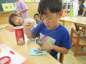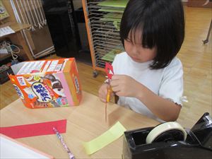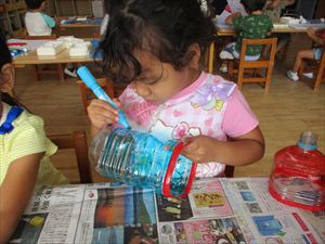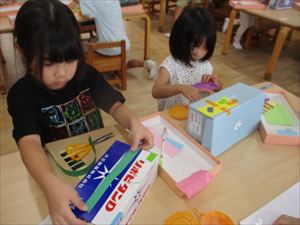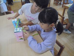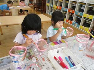 雄踏総合公園に行き、自然散策をする予定です。 幼児部の子ども達は、自分達で自然散策をする時に使う 【 遠足バック 】を製作して準備をしています。 たんぽぽ組(年少)さんは、ペットボトルにカラーペンで自由に絵を描いて、 ひまわり組(年中)さんは、画用紙にカラーペンで絵を描いて、牛乳パックに 貼りました。ゆり組(年長)さんは、空き容器を自分達で選んで 色々な工夫を凝らしてオリジナルバックを製作中です。 『 このバックをどんぐりでいっぱいにするんだ! 』 『 ぼくは、虫もさがすよ! 』 今から、遠足の秋探しを心待ちにしている子どもたちです。 |