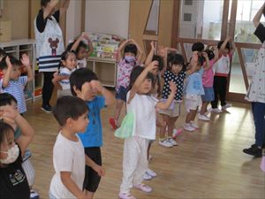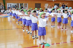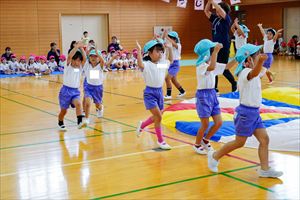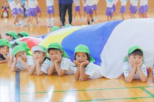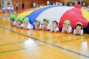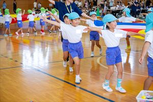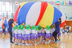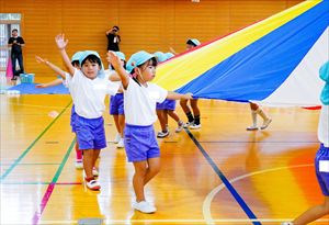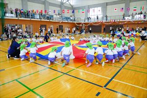 ひまわり組(年中)とゆり組(年長)によるバルーン演技です。大きな丸い布(バルーン)を持ち、空気を入れて膨らませたり、波を作ったりなど