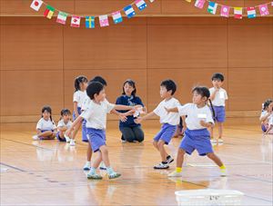 | 芝生広場で【 ふれあい遊び 】を楽しみました。手を繋いで輪になって・・・大好きなお兄さん、お姉さんと一緒に
