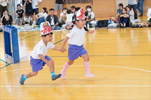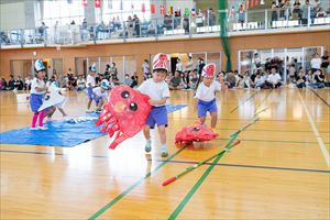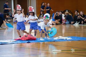 運動会ナイスショット第5弾です。年中組僥倖種目【 運んでみよう!!海の仲間たち 】の様子です。