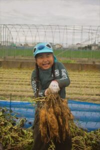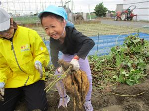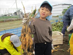 土を触ることに抵抗があり、なかなか掘りだせない子もいましたが お友だちが掘っているのを見て、やってみようとチャレンジしていました。 『 お芋掘りって楽しかった~ 』と、笑顔になっていました。 土の匂いや感触を感じながらお芋を掘る経験。 虫を見つけてちょっとだけ勇気を出して触ってみる経験。 大好きなお友達や先生と自然に触れて楽しむ経験。 秋ならでは素敵な体験が出来ました。 おうちに持って帰ったお芋は、どんなお料理になるのかな? 自分たちが収穫したものを食べるのもまた嬉しい経験ですよね💛 玉ちゃん会の皆様、貴重な体験をありがとうございました。 |
