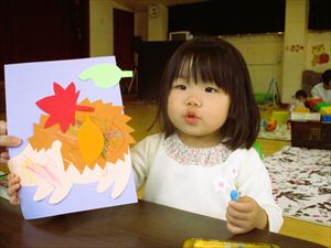 園庭では、落ち葉が風でクルクルと舞い、それを追いかける子ども達 の元気な姿が見られます。 今日のちびっこ広場の様子です。 今回の製作は、【 ハリネズミ 】です。 ハリネズミの針は、クレヨンでなぐり描きしました。 グルグルグルン トントントン グルグルグルン 目をクレヨンで描いた後は、周りに紅葉(もみじ)や落ち葉を 両面テープを剥がして貼り、飾りつけして完成~!! |