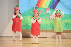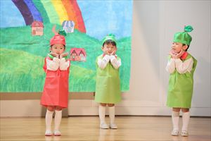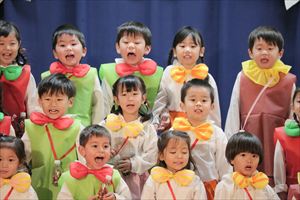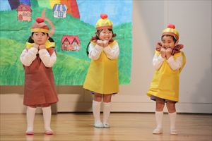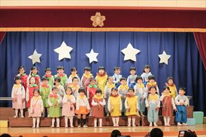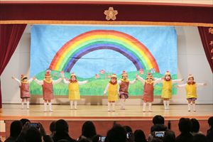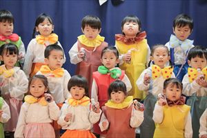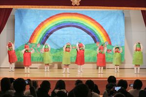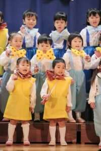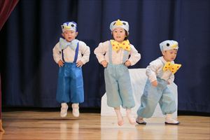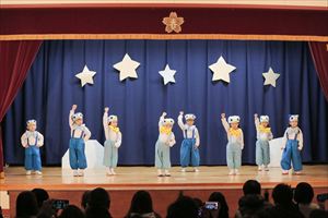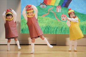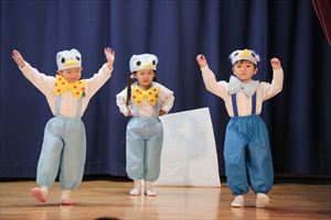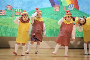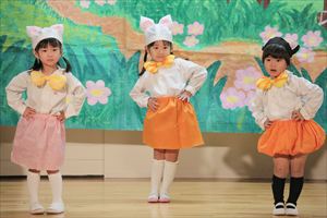 | はじめての発表会のたんぽぽ組の子ども達。最初は保育室で踊りを覚えて、ホールで踊る練習も何回かしてきました。