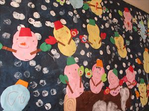 雪は、芋スタンプです。好きな色の画用紙を選んで、はさみで