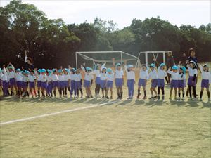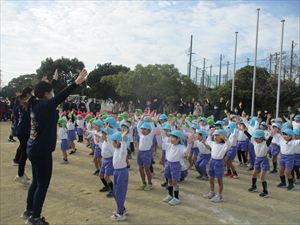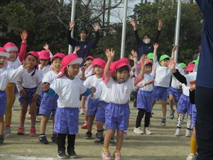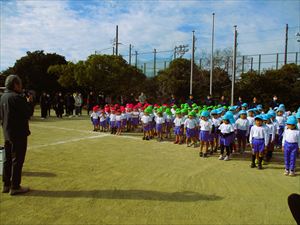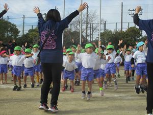 おうちの方もたくさん応援に来てくれて、やる気がパワーアップしたようです。 全員で♬ ワンツー体操 ♬ で、準備体操です。 |
