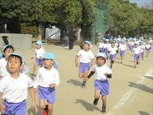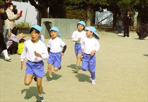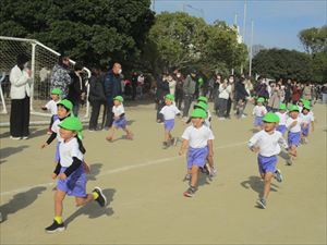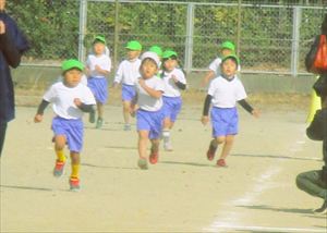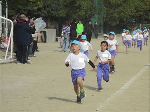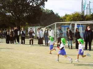 初めてのマラソン大会、頑張るぞ!! 『 よーいドン! 』 直線の170メートルのコースを駆け抜けます。 頑張れ! 頑張れ! おうちの方の声援にも背中を押されて、ゴールまで頑張って走ったね! |