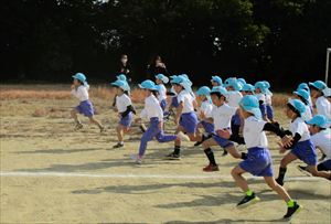『 よーい ドン! 』合図で一斉にスタート。 転んでも、苦しくても、友達に抜かれても、最後まで諦めずに全員が無事完走できました。 |