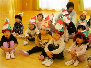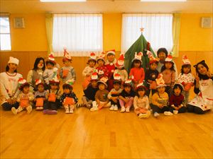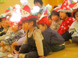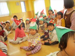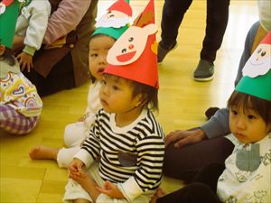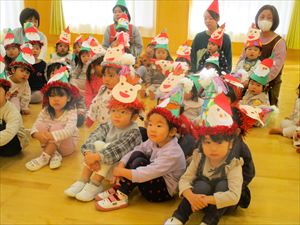 | こちらは、乳児部さんとすずらん組(満3歳児)さんのクリスマス会の様子です。始めに、手遊び、紙芝居【 くうすけのクリスマス 】の読み聞かせをしました。みんな手作りのオリジナル三角帽子を被って、とってもかわいいでしょ★★★ |