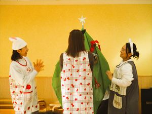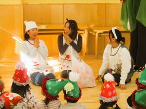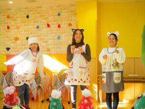 『 ねぇ、もうすぐクリスマスだから、ツリーに飾りをつけようよ! 』 さぁ、無事に飾りつけをして、クリスマスプレゼントをもらえるのかな? サンタさんやトナカイも出てきて、子ども達は興味津々に お話を楽しんでいましたよ。 最後に、サンタさんの提案で、みんなでダンスをすることになりました~♪ |