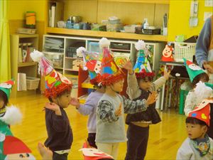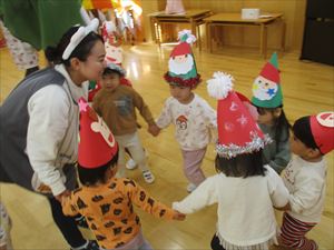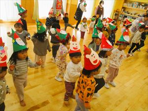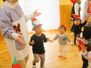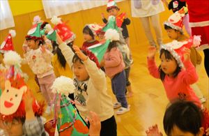 | 踊り♬ クリスマスの歌が聞こえてくるよ ♬とっても可愛らしい振り付けのこの踊りは、子ども達が大好きなクリスマスソングのひとつです★★★多目的ホールには、楽しい音楽と子ども達の笑い声が響いていました♪ |