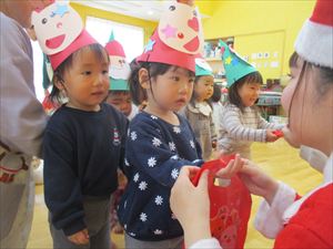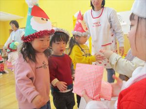 サンタさんが近くに来て、子どもたちは少し緊張した表情に・・・。 ニコニコ笑顔でサンタさんを見つめる子や、先生の後ろに隠れちゃう子、 怖がっちゃう子など、色々な表情を見せてくれた子どもたち。 『 みんなにプレゼントを持ってきたよ 』 『 サンタさん、ありがとう~! 』 1人ずつ手渡しで、クリスマスプレゼントをもらうことが出来ました💓 |