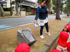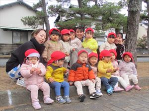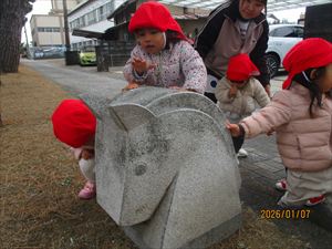 | もも組(1歳児)さんが、松並木通りの干支の石像を見に園外保育に出掛けました。