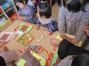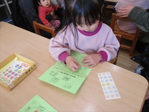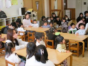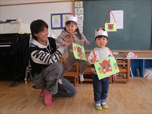 今回のテーマは、【 保育を体験してみよう 】です。 ペープサート【 コンコンクシャンの歌 】を楽しんだ後は、 朝の会で、出席カードにシールを貼ってみました。 『 わぁ、上手に貼れたね! 』おうちの人や先生に褒められて ニコッと笑顔を見せてくれる子もいました。 |