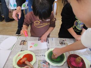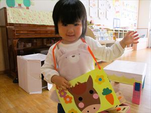 野菜スタンプは、初めての子も多く、台紙の画用紙についた野菜の形 を不思議そうに見たり、野菜を変えて違う形を楽しむ姿が 見られました。目や頬、人参、花の画用紙を両面テープを貼って 飾りつけをしました。 とっても可愛らしい馬のバックが完成しましたよ~★★★ |