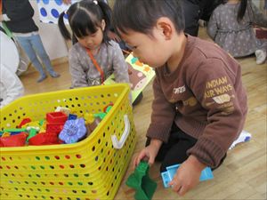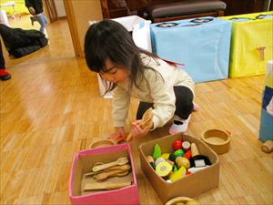 | 自由遊びコーナーでは、ままごとやブロック遊びで夢中に遊ぶ
