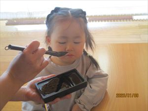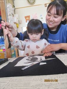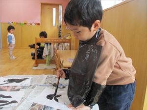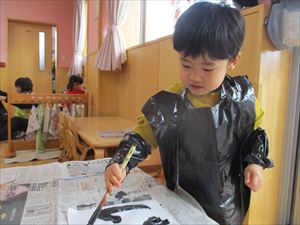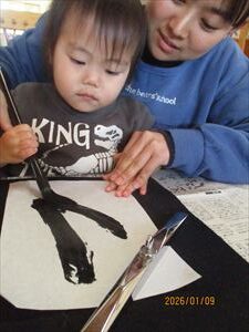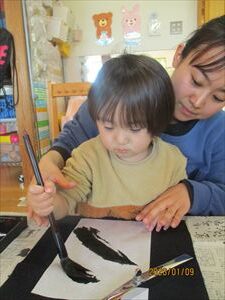 | 乳児部さんが、毎年恒例の書き初めを体験しました。こちらは、つくし組(0歳児)さんともも組(1歳児)さんがの様子です。