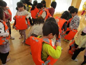 | 多目的ホールに避難し、整列、点呼、報告をした後は、ライフジャケット着脱練習もします。