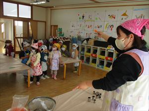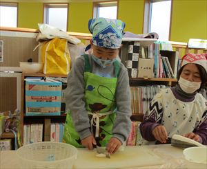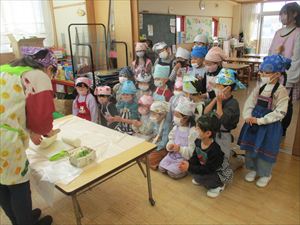 順番を待ってる間は、大根の匂いを感じて・・・、 『 大根の匂いする! 』 『 大根に添える手は・・・? 』『 猫の手! 』 包丁の使い方、手の添え方を学んでから、体験していきます。 |