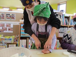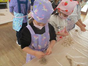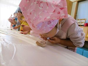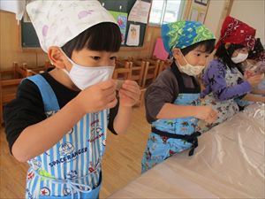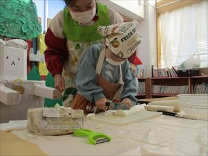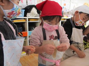 『 かたいなぁ~ 立って力を入れて押さないと上手くできないよ 』 『 やったぁ!! できたよ 』 調理する前の人参って、こんなに硬いんだね。 『 こんにゃくって グニャグニャしてて上手くちぎれないなぁ 』 固さの違いを楽しみながら、調理を楽しんでいました。 |