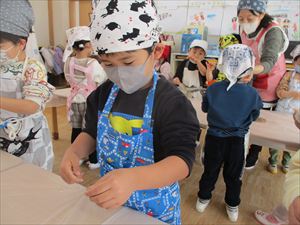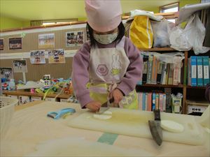 | 真剣な表情で【 大根のいちょう切り 】に挑戦しているゆり組(年長)さん。