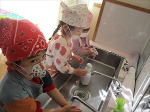 エプロン、マスク、三角巾をつけて、さぁ、手洗いもしましょう~!! 『 おいしい豚汁つくるぞ~! 』 |