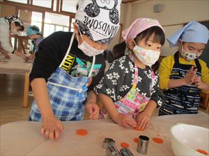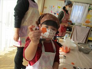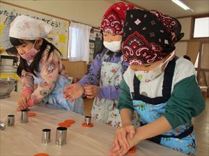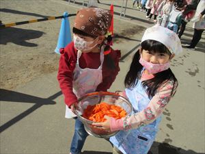| 【 人参の型抜きとこんにゃくちぎり 】の担当は、ひまわり組(年中)さん。