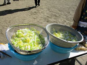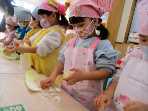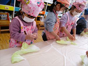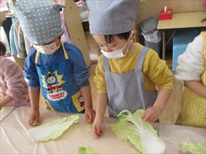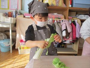 | たんぽぽ組(年少)さんは、【 白菜ちぎり 】の体験をしました。