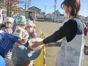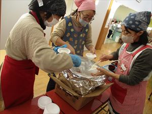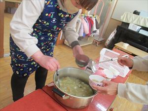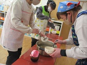 | 自宅から持ってきた子ども達のお椀に、先生達が配膳していきます。