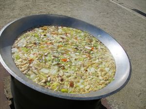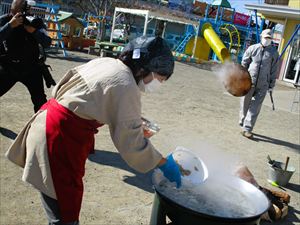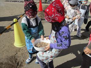 保育室で調理した野菜を園庭の大鍋まで運んで、目の前で鍋に投入します。 子ども達のお手伝いとおまじないのおかげで、野菜のおだしたっぷりの おいしいそうな豚汁が完成しました!! |