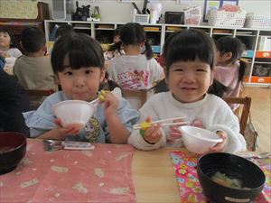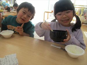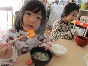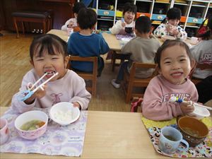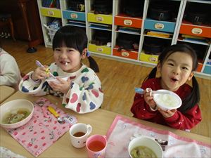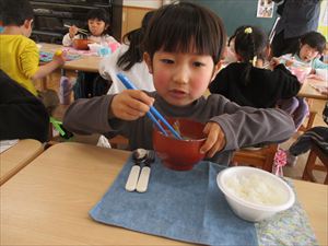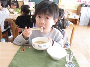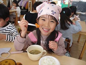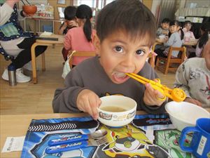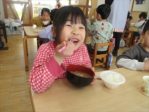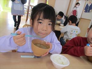 | 『 いただきます! 』豚汁の出来上がりを首を長くして待っていた子ども達。どの子も期待いっぱいに豚汁を一口・・・。