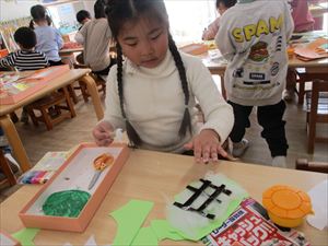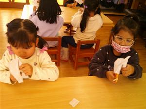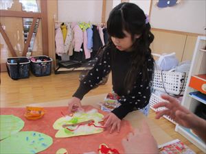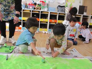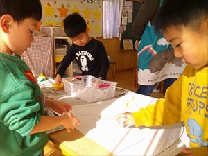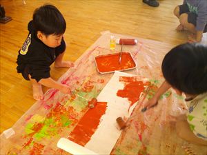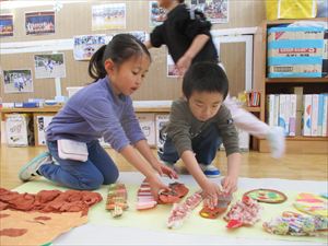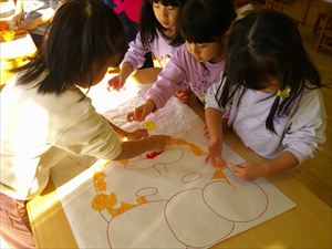 浜松市私立幼稚園絵画展が開催されます。 今年度、春日こども園では、【 パンどろぼう 】の絵本を題材に 3学年で共同製作をしました。 たんぽぽ組(年少)さんは、看板とパンを置く棚の色付け担当です。 ローラーを使って、模造紙に色を塗りました。 ひまわり組(年中)さんは、主人公のパンどろぼうとパン職人の おじさんの担当です。 半紙にローラーで色を塗って、乾いてからクシャクシャと丸めて広げました。 その紙を手でちぎって、台紙に糊付けしました。 台紙に描いてある絵の線を見て、はみ出さないように ペタペタペタペタ。 おじさんの着ている白衣は、素材を変えて緩衝材をはさみで切って糊付けしました。 ゆり組(年長)さんは、パン屋さんに並べるパンを作ります。 しろくまパン、カメパンなど可愛らしい動物パンやハード系のパンなど。 身近な素材を使って工夫して、世界にひとつだけのパンを作りました。 看板の文字は、ゆり組さんが担当して書きました。 子ども達のアイディアが、たくさん溢れている春日ならではの パンどろぼうの世界を、会場に足を運んでお子様とのお話も楽しみながら、 ぜひ、ご鑑賞ください!! |