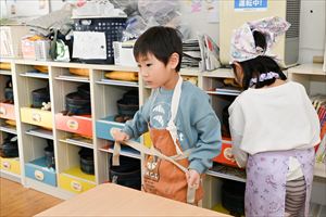 給食当番の子が、先生と一緒に一つ一つの動作を確認してやっています。