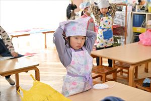 エプロンのちょうちょ結びと三角巾のコマ結びをしています。