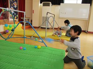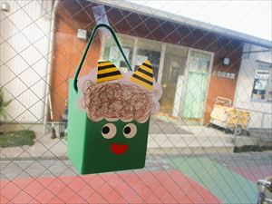 角をつけたフープに幅広テープを貼り、鉄棒に紐でぶら下げて、 鬼の完成~。カラーボールを豆に見立てて・・・ 『 おには そと! ふくは うち! 』 鬼退治を楽しみました。ボールが的にペタリとくっつくことが、 面白くて、次々とボールを投げていましたよ💛 |