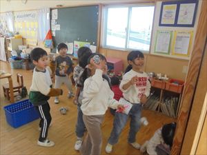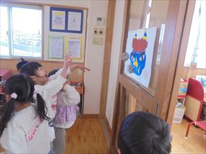 節分を前にひまわり組(年中)さんが、保育室で鬼の絵に向かって