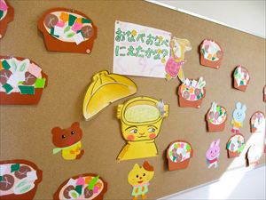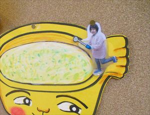 | 『 おなべおなべ にえたかな? 』グツグツ コトコト 新園舎の廊下壁面にとっても美味しそうな