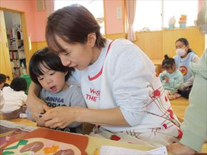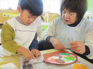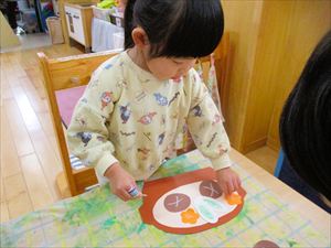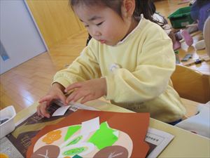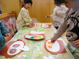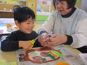 の製作をしました。 土鍋の中に具材の椎茸、人参、ネギなどを両面テープを剥がして ペタペタペタ。 今回の製作では、1回でチョキンと切る【1回切り】を経験しました。 正しい持ち方で、先生と一緒に画用紙を チョッキン!! 『 わぁ~ 切れたよ! 』 切った後は、糊付けして鍋に追加投入~!! おいしそうな豆腐も入れて、冬の定番の鍋作りを楽しみました。 |