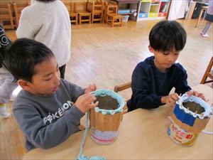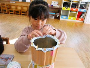 道具は、割り箸とミルク缶で作ります。 『 おもしろそう! 』『 僕もやってみたい! 』 と、思った子どもたちが家から毛糸を持参して編んでいます。 先生に教えてもらいながら指先を動かし編み込んでいきます。 『 思っていたより難しいなぁ~ 』 『 あれ? 次は、どうしたらいいんだっけ? 』 手先と毛糸の動かし方に慣れるまでは、悪戦苦闘しながら根気強く挑戦しています。 今までいろいろな事を諦めずに挑戦してきたゆり組さんの集中力と根気は 素晴らしい! 『 明日もまたやりたい! 』 と意欲を持ってリリアン編みを楽しんでいます。 完成したら、また紹介しますね~☆ |