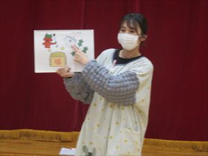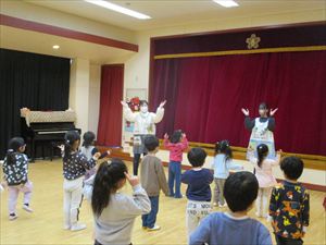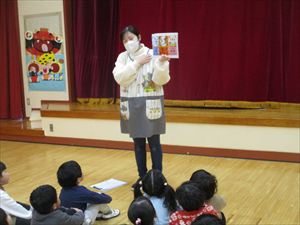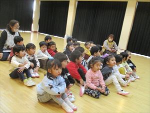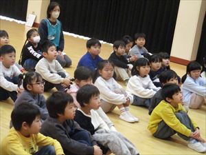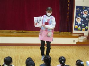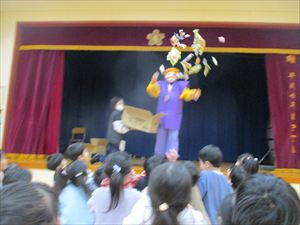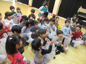 | 今日は、豆まき会が行われました。こちらは、幼児部の様子です。先生『 豆まきって節分とも言うんだよ。節分は、冬と春の季節を