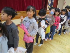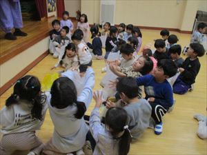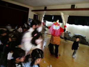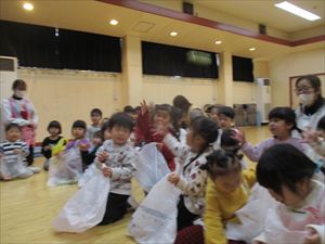 | ドキドキの鬼退治の後は、頑張った子ども達の前に福の神様がやってきて【 福菓子まき 】をしてくれました。『 心の鬼を追い払ったみんな、1年間怪我や病気にならないよう